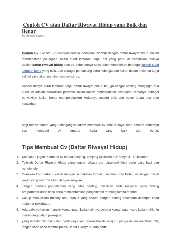 Contoh Cv Atau Daftar Riwayat Hidup Yang Baik Dan Benar from imgv2-2-f.scribdassets.com Pembuatan daftar riwayat hidup memang sangat penting ketika mau melamar pekerjaan. Membuat daftar riwayat hidup adalah salah satu proses awal yang harus anda lakukan sebelum melamar pekerjaan ke perusahaan yang anda inginkan. Membuat daftar riwayat hidup dalam rangka melamar pekerjaan adalah hal wajib bagi calon pelamar.