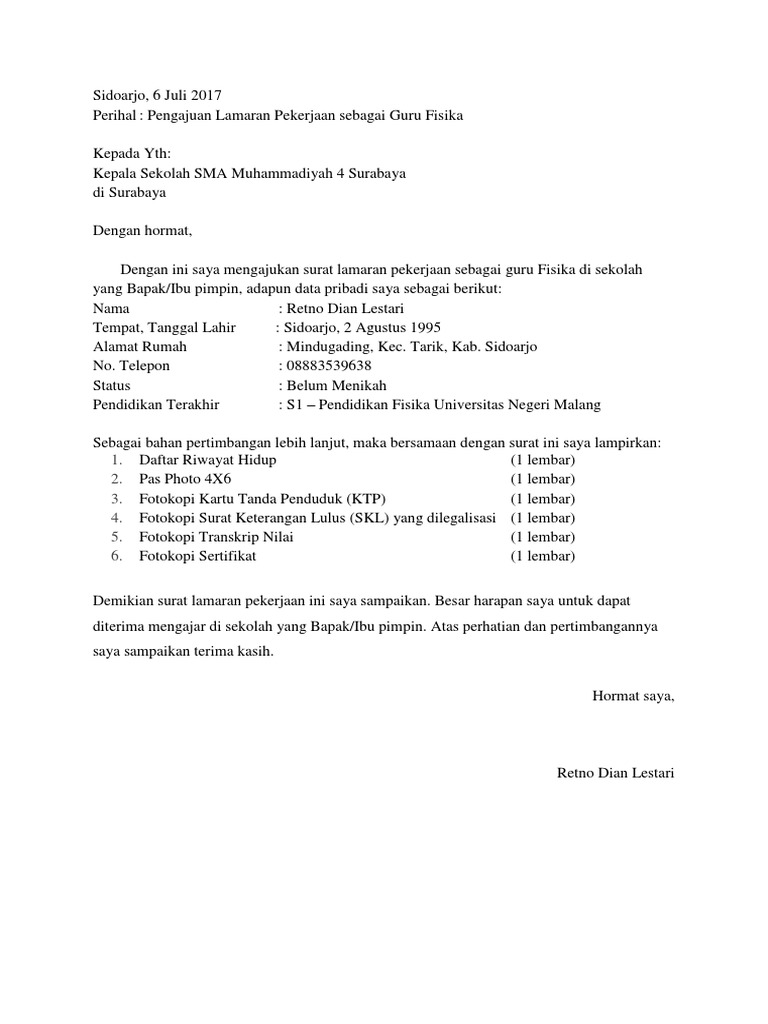 Untuk membuat jenis surat lamaran ini, anda perlu perhatikan bawa tempat dimana anda akan bekerja merupakan institusi formal, yang dengan ini saya membuat permohonan lamaran pekerjaan untuk menjadi guru honor di sekolah yang bapak/ibu pimpin, adapun data pribadi saya sebagai berikut Demikian surat lamaran ini saya buat. Surat lamaran untuk melamar kerja adalah lampiran lamaran kerja yang akan dilihat dan dibaca pertama kali oleh bagian hrd personalia. Karena kami akan menyajikan banyak contoh surat lamaran.